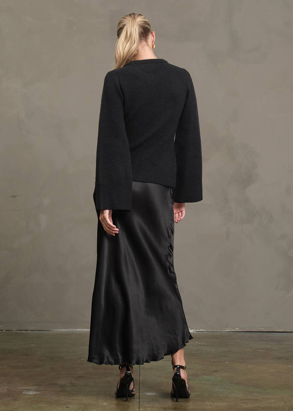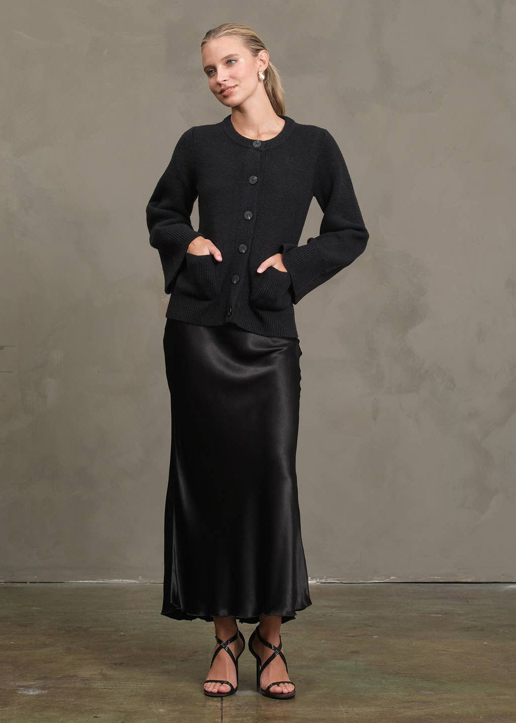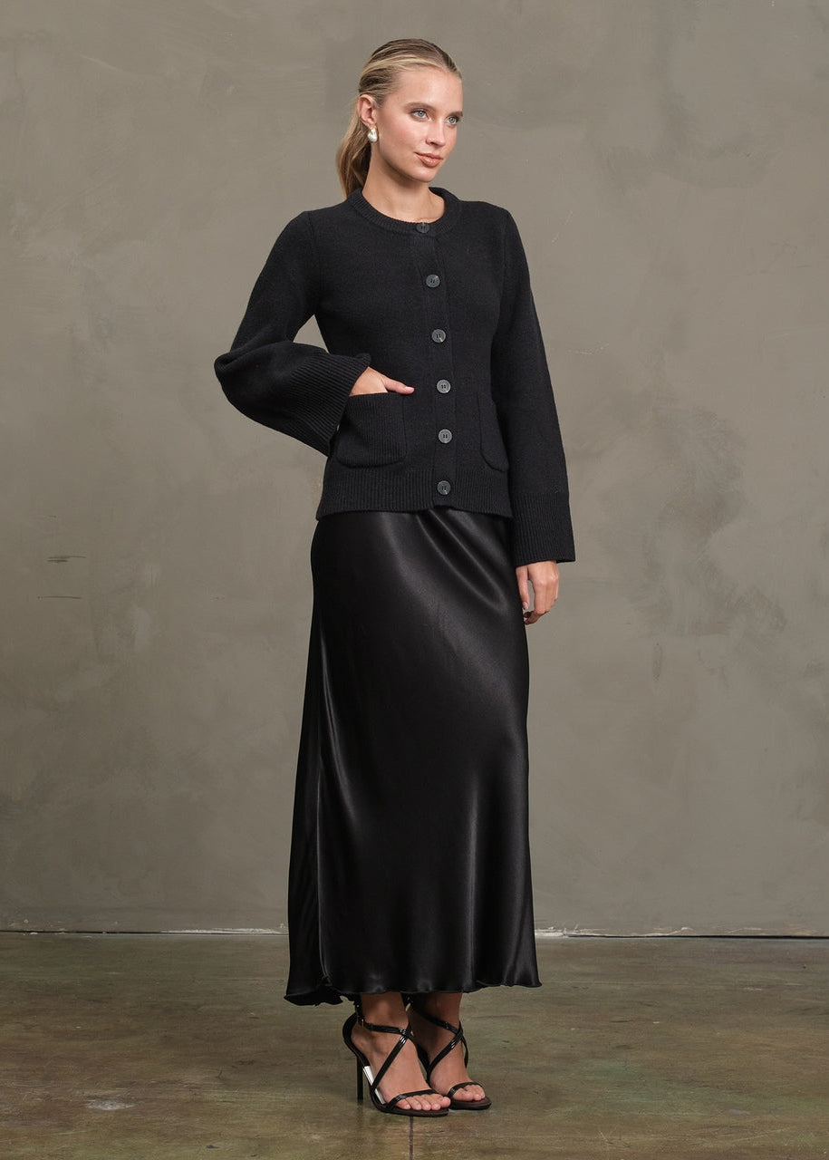 A classic knit cardigan with a modern twist — featuring- -Soft mid-weight knit -Bell sleeve detail -Front patch pockets -Horn-style buttons -Clean round neckline