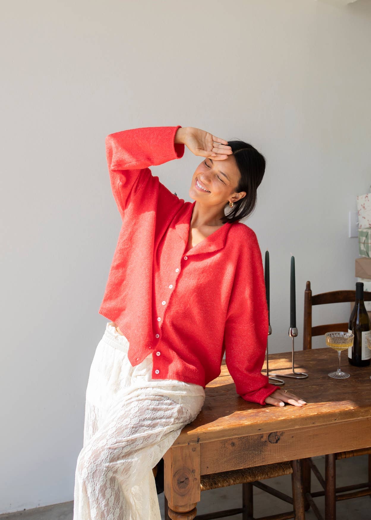 Soft and cozy lightweight cardigan with rolled edge finish on the sleeves and collar.