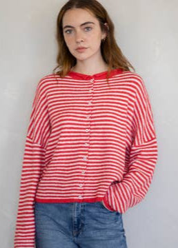 our soft and lightweight Piper Cardigan in striped red is 61% Polyester, 15% Viscose, 15% Nylon, 6% Wool, 3% Spandex.